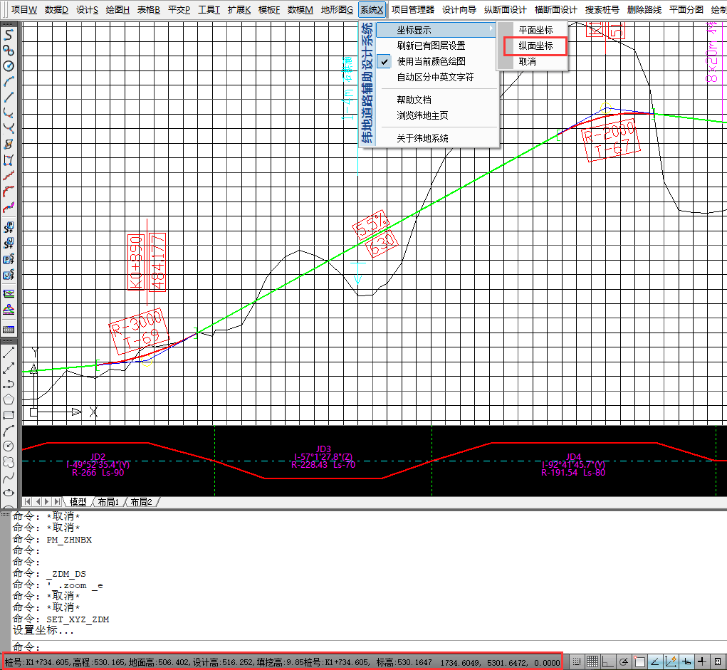 2、在纵断面拉坡设计中,开启系统菜单下的纵面坐标显示,即可在CAD命令行下部实时显示桩号、设计高和高差这些数据;同时,结合屏幕中显示的纵横向桩号和高程网格线,便可直观地、实时浏览到各个桩号高程控制点位的具体情况了。不知道是否能够满足您的需求呢?