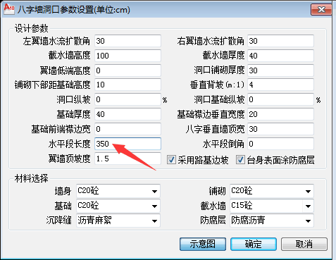 你好!在八字墙洞口参数设置中,设置水平段长度即可实现你的需求,并且把翼墙低端高度设为0,如下图所示: