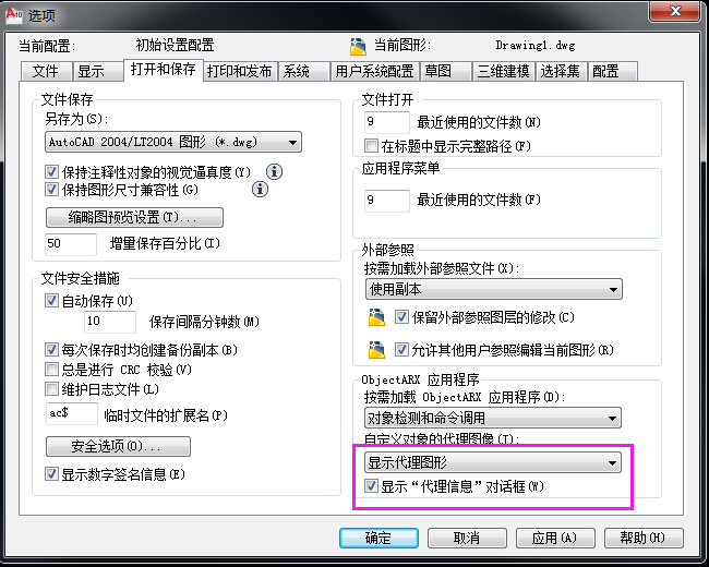 打开代理图形流程:工具→选项→打开与保存,选择“显示代理图形”,截图如下(流程及截图针对2010cad,其他cad可能略有差别)
